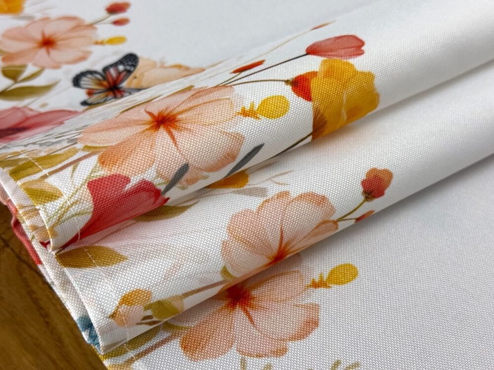 Dekoracyjny bieżnik 40×140 cm w kwiaty i motyle to elegancki element aranżacji stołu inspirowany motywem wiosennej łąki. Jasna tkanina stanowi subtelne tło dla kolorowych polnych kwiatów oraz delikatnych motyli, które wprowadzają do wnętrza pogodny, wiosenny charakter.