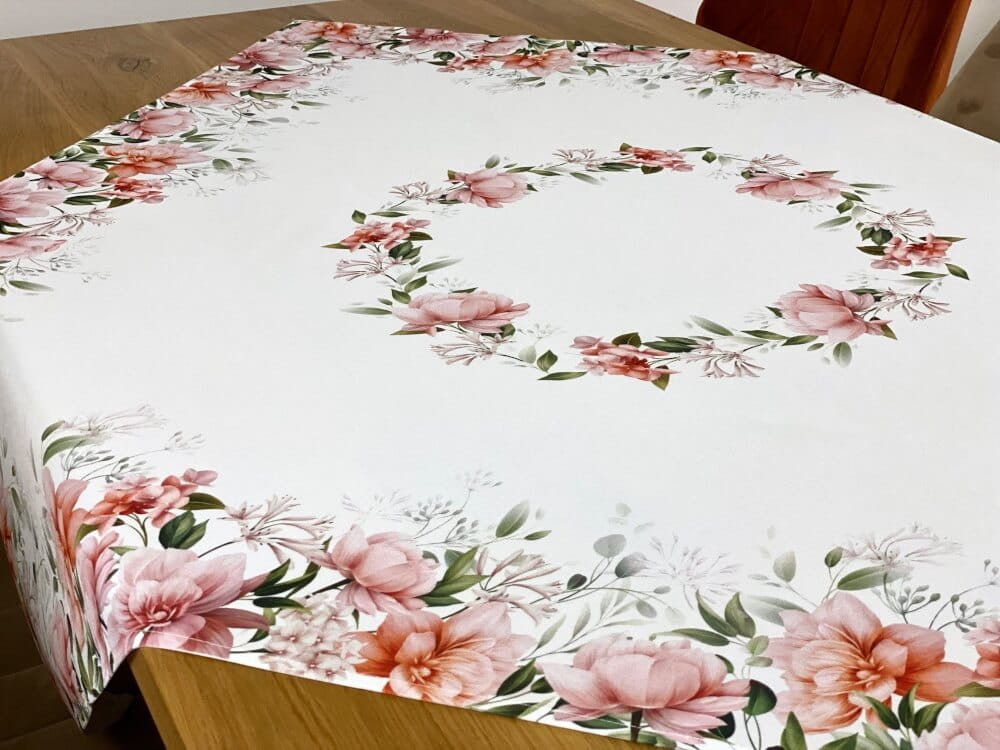 Kwadratowy obrus 110×110 cm z kwiecistym nadrukiem to dekoracyjny element aranżacji stołu, który wprowadza do wnętrza świeży, wiosenny charakter. Jasna tkanina stanowi delikatne tło dla pastelowych kwiatów w odcieniach różu i brzoskwini, które tworzą elegancką kompozycję dekoracyjną.