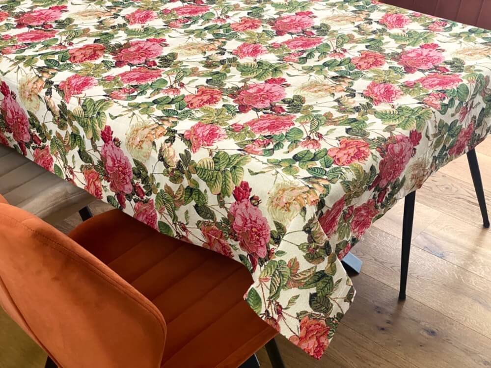 Bogaty motyw róż doskonale komponuje się z drewnianymi meblami oraz wnętrzami w stylu klasycznym, rustykalnym i romantycznym. Obrus wprowadza do aranżacji stołu elegancję i dekoracyjny charakter.
