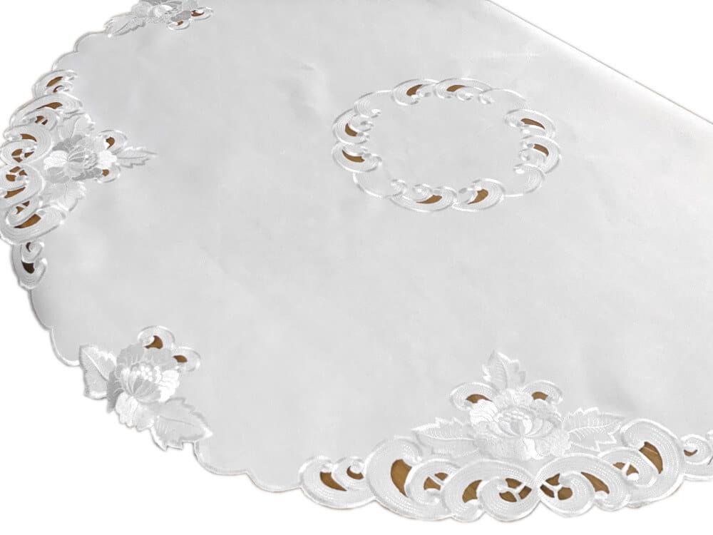 Obrus okrągły 130 cm – Amelia, biały haft i ażur