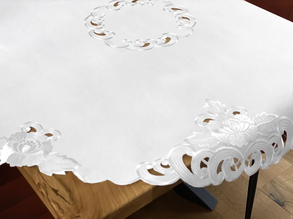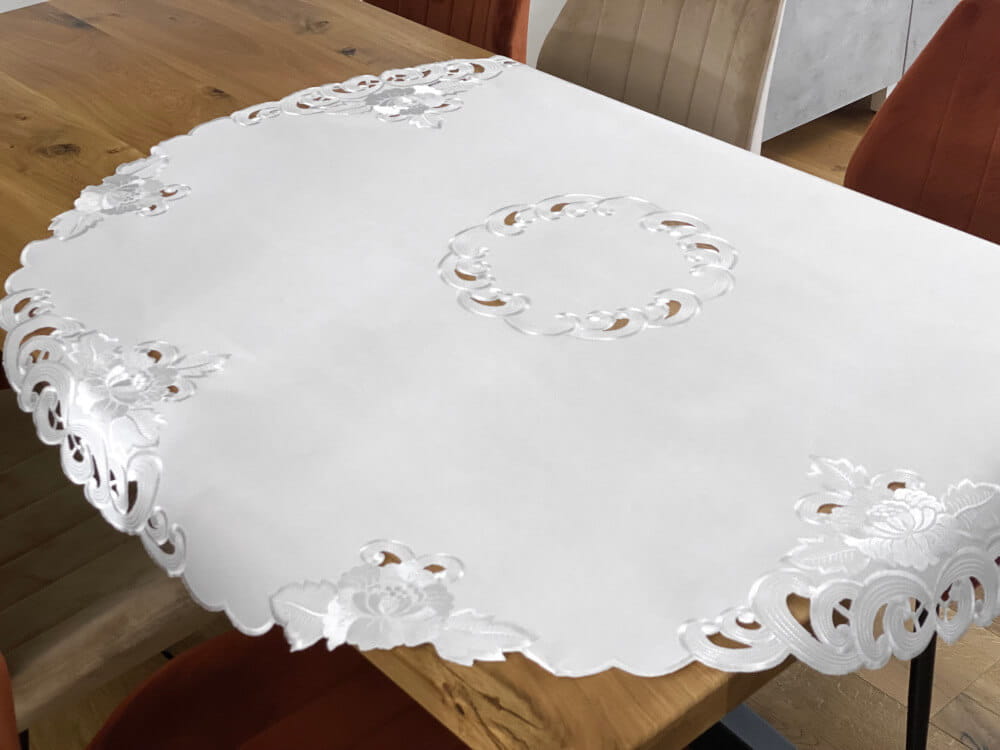 Zdobiony brzeg obrusu stanowi dekoracyjną ramę dla gładkiej części środkowej, dzięki czemu stół wygląda schludnie i harmonijnie, a jednocześnie pozostaje praktyczny w codziennym użytkowaniu. Centralna strefa pozwala wygodnie ustawić zastawę, wazon lub dekoracje sezonowe, bez wrażenia nadmiaru zdobień.