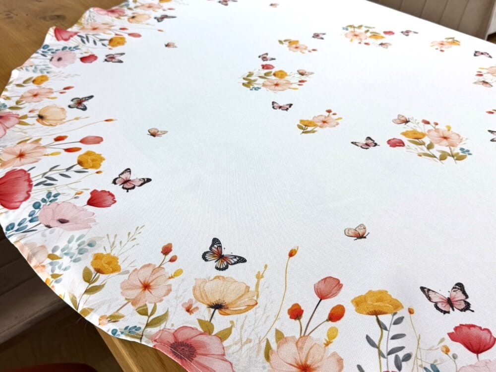 Obrus okrągły śr. 130 cm – łąka kwiatowa z motylami