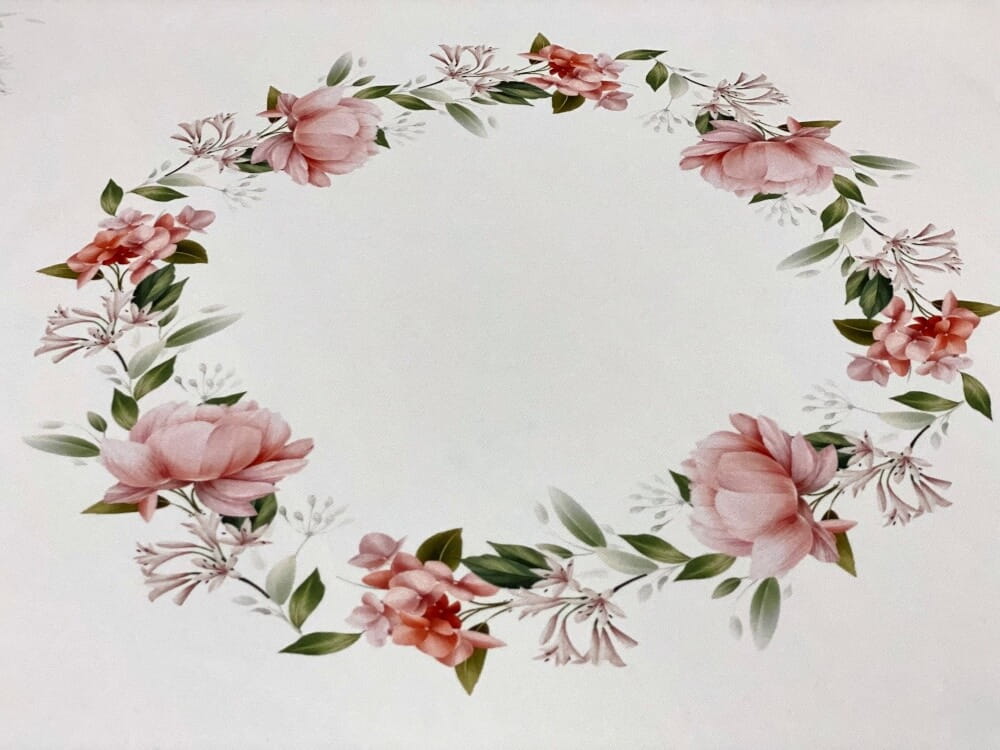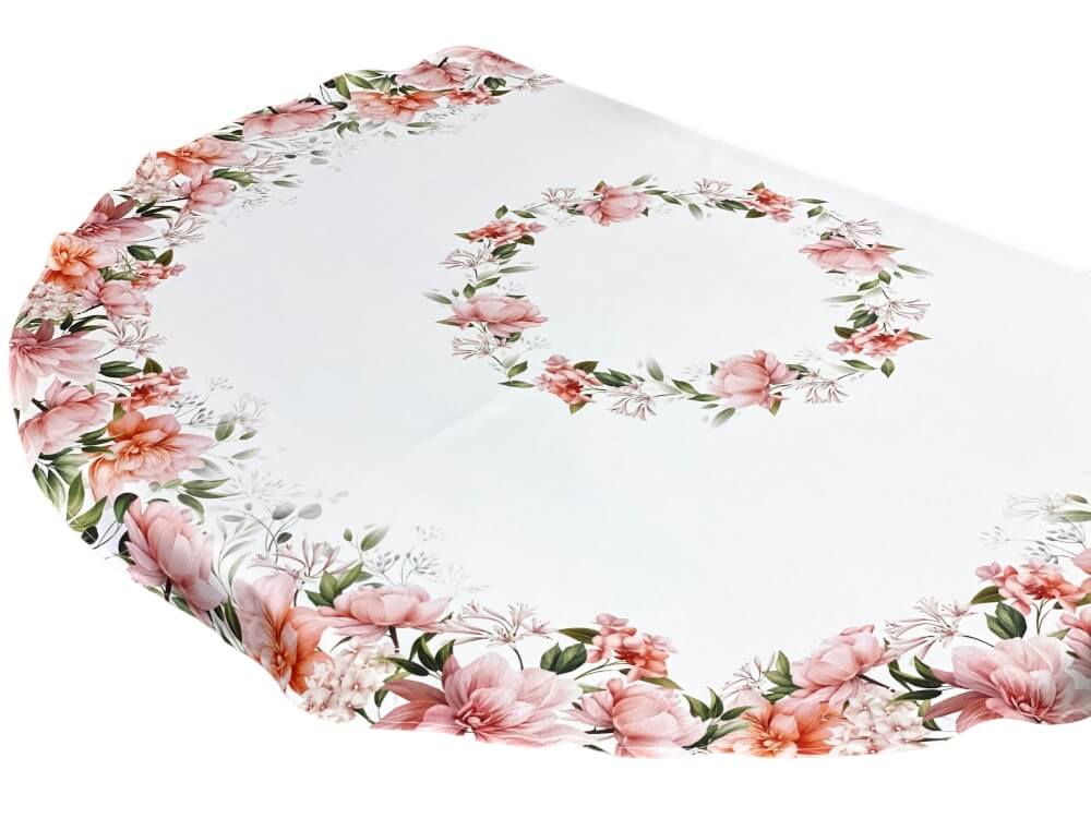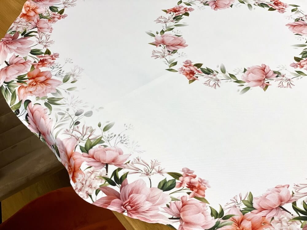 Centralnym elementem wzoru jest okrągła kompozycja z kwiatów, która pięknie podkreśla kształt stołu i przyciąga uwagę podczas wspólnych posiłków. Dodatkowy motyw kwiatowy przy krawędzi materiału tworzy dekoracyjną ramę i sprawia, że obrus prezentuje się elegancko z każdej strony.