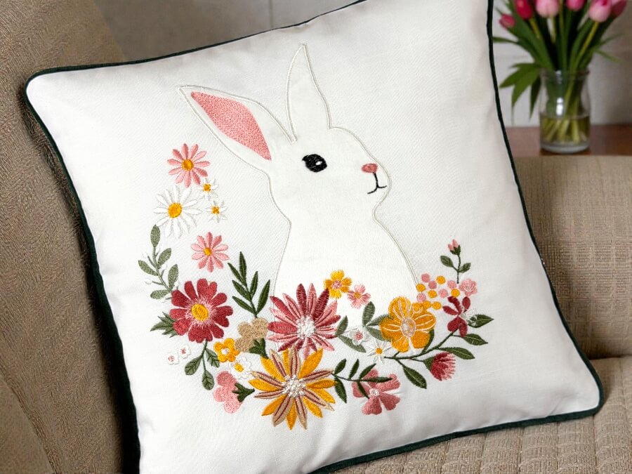 Biel, zajączek i haftowane kwiaty — wiosna w najczystszej, eleganckiej wersji.