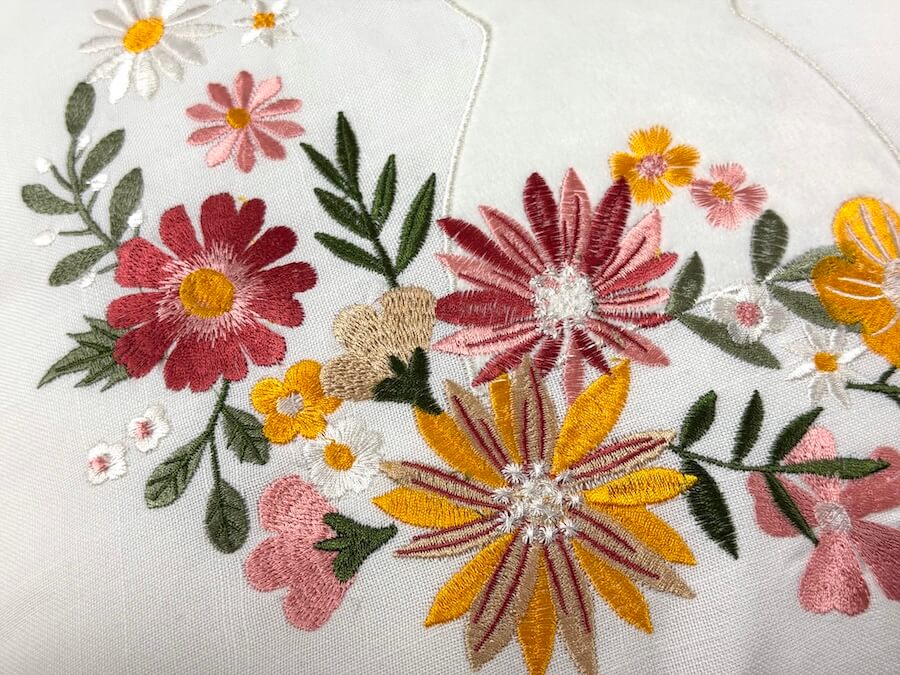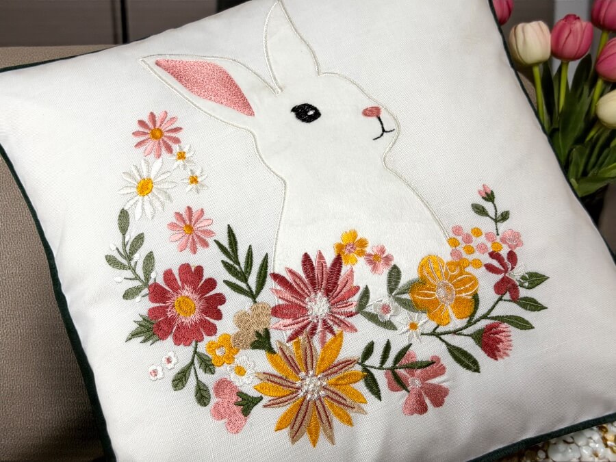 - Wzór: zajączek + haftowane, kolorowe kwiaty i liście (wiosenny motyw)