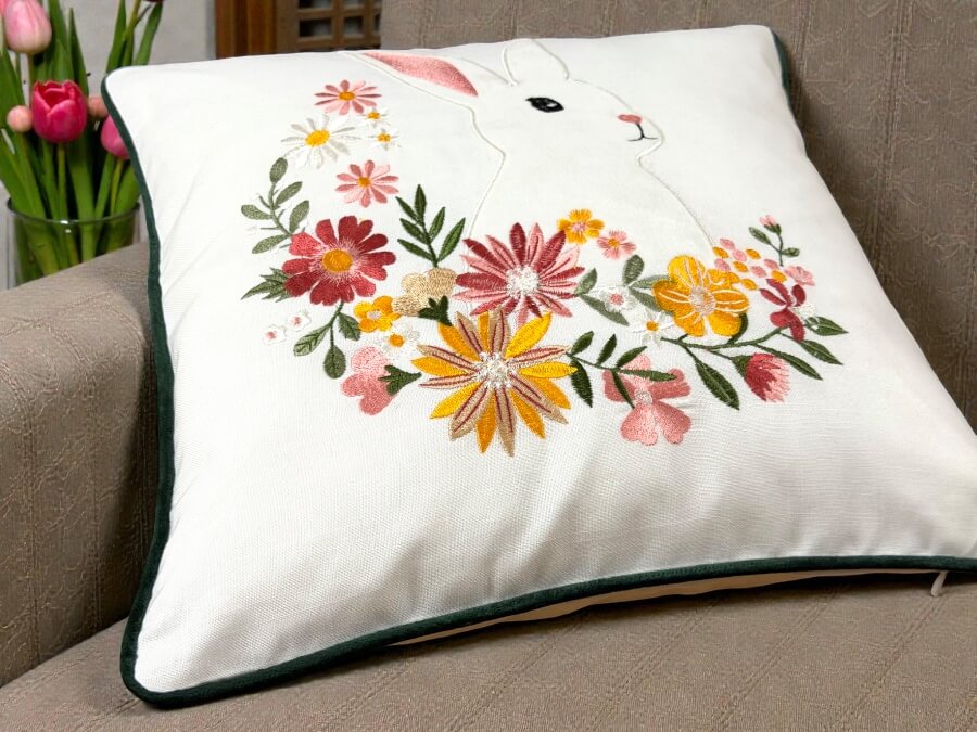 Ta poszewka wielkanocna 40x40 cm to dekoracja, która rozjaśnia wnętrze i od razu wprowadza wiosenny nastrój. Na białym tle znajduje się zajączek otoczony haftowanymi kwiatami w ciepłych, radosnych kolorach, a całość wykańcza ciemnozielona lamówka, która dodaje kontrastu i wygląda bardzo schludnie na sofie czy fotelu. Poszewka ma przyjemny, „naturalny” look i dobrze sprawdza się w codziennym użytkowaniu. Ukryty zamek ułatwia zdejmowanie, a gładki tył pozwala łatwo łączyć ją z innymi poduszkami.