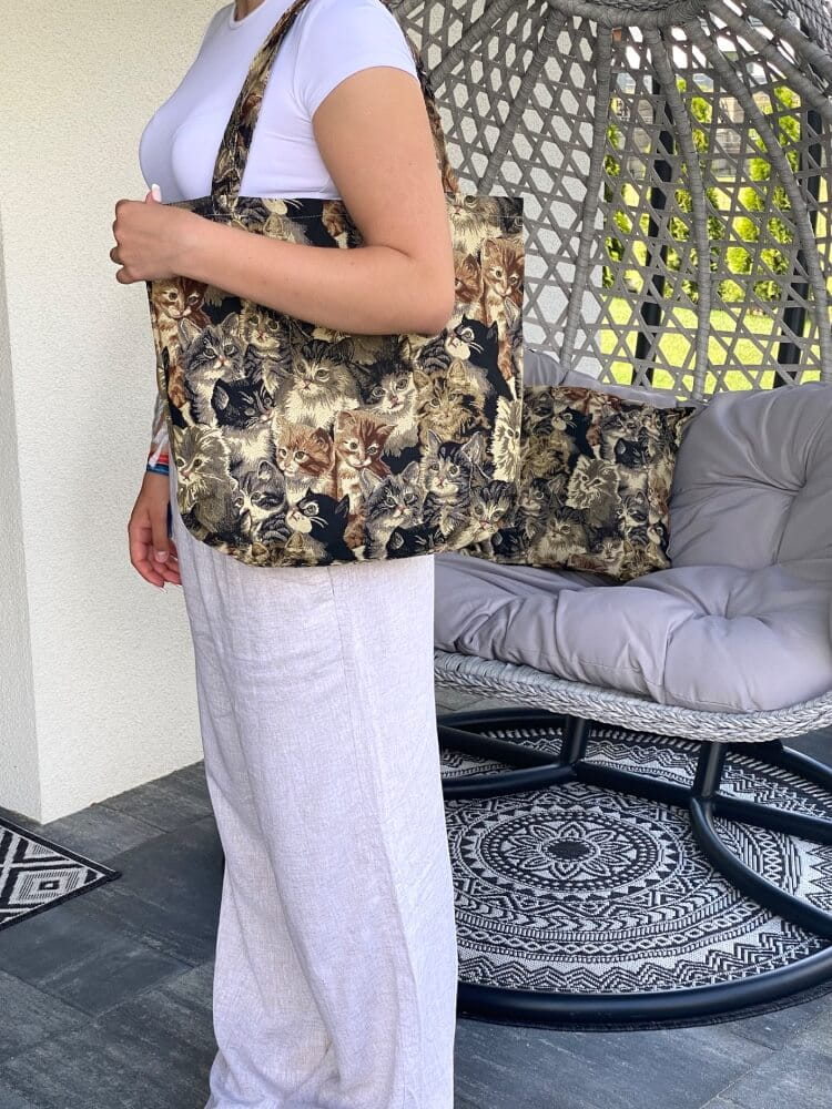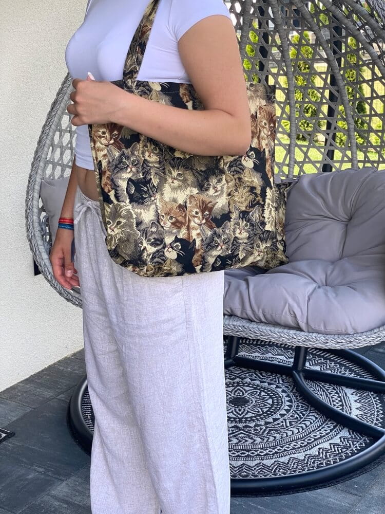 Wzór w koty przyciąga uwagę i wyróżnia torbę wśród klasycznych modeli.