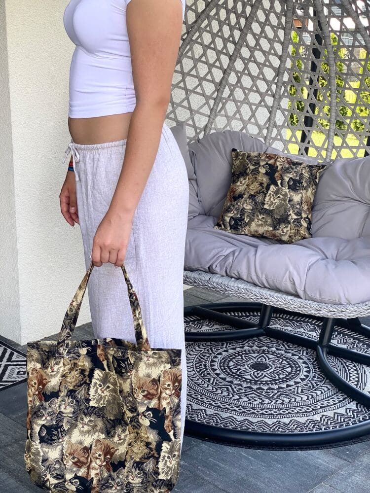 Torba gobelinowa Koty klasyczne wyróżnia się gęstym, realistycznym wzorem przedstawiającym różne rasy kotów. Wzór ma charakter ilustracyjny, zbliżony do klasycznych tkanin dekoracyjnych, dzięki czemu torba wygląda bardziej dekoracyjnie niż standardowe torby materiałowe.