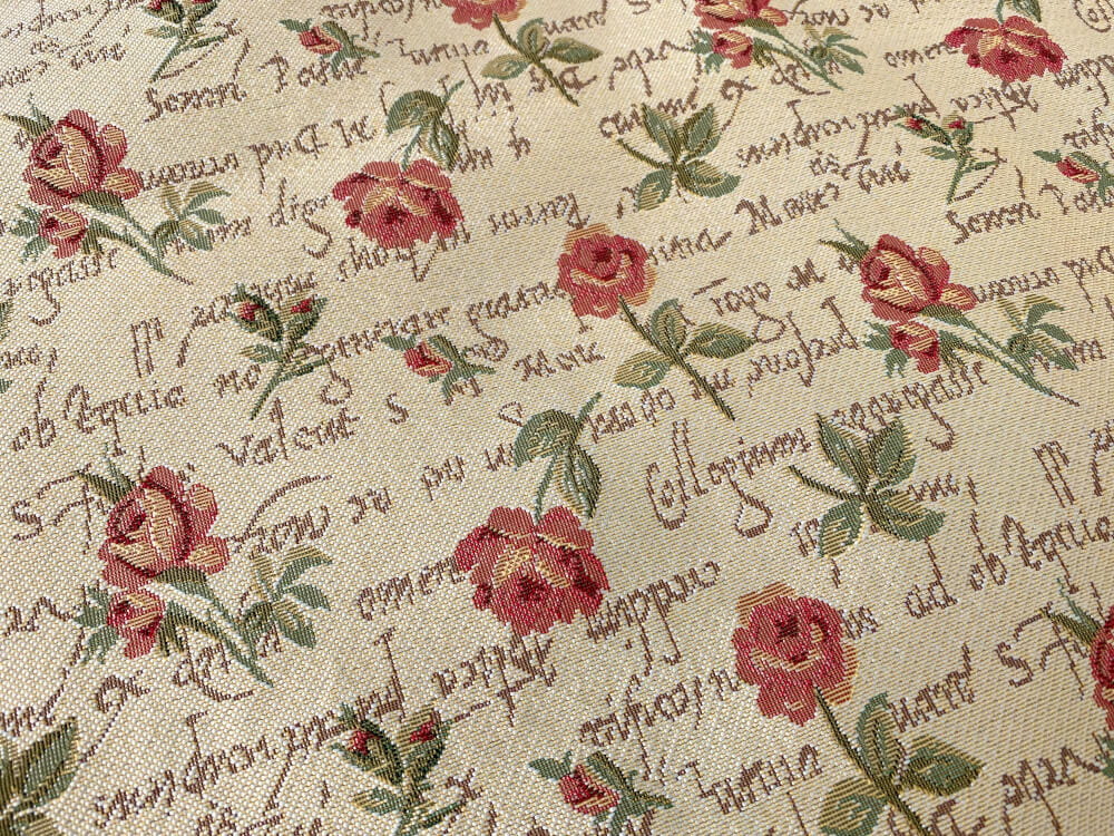 Torba gobelinowa „Różyczki” to model utrzymany w klasycznej stylistyce, łączący delikatny motyw kwiatowy z subtelnymi, dekoracyjnymi napisami. Jasne tło podkreśla czerwone i różowe róże oraz zielone liście, tworząc uporządkowaną i estetyczną kompozycję.